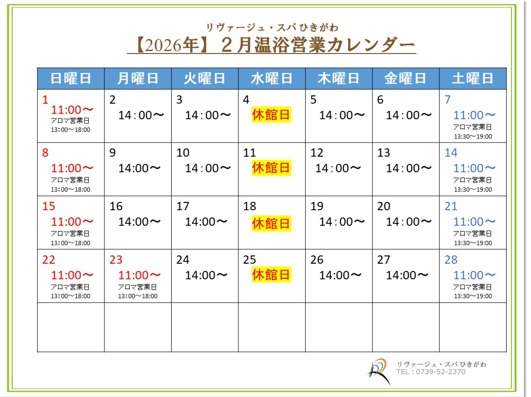 日帰り入浴 営業カレンダー